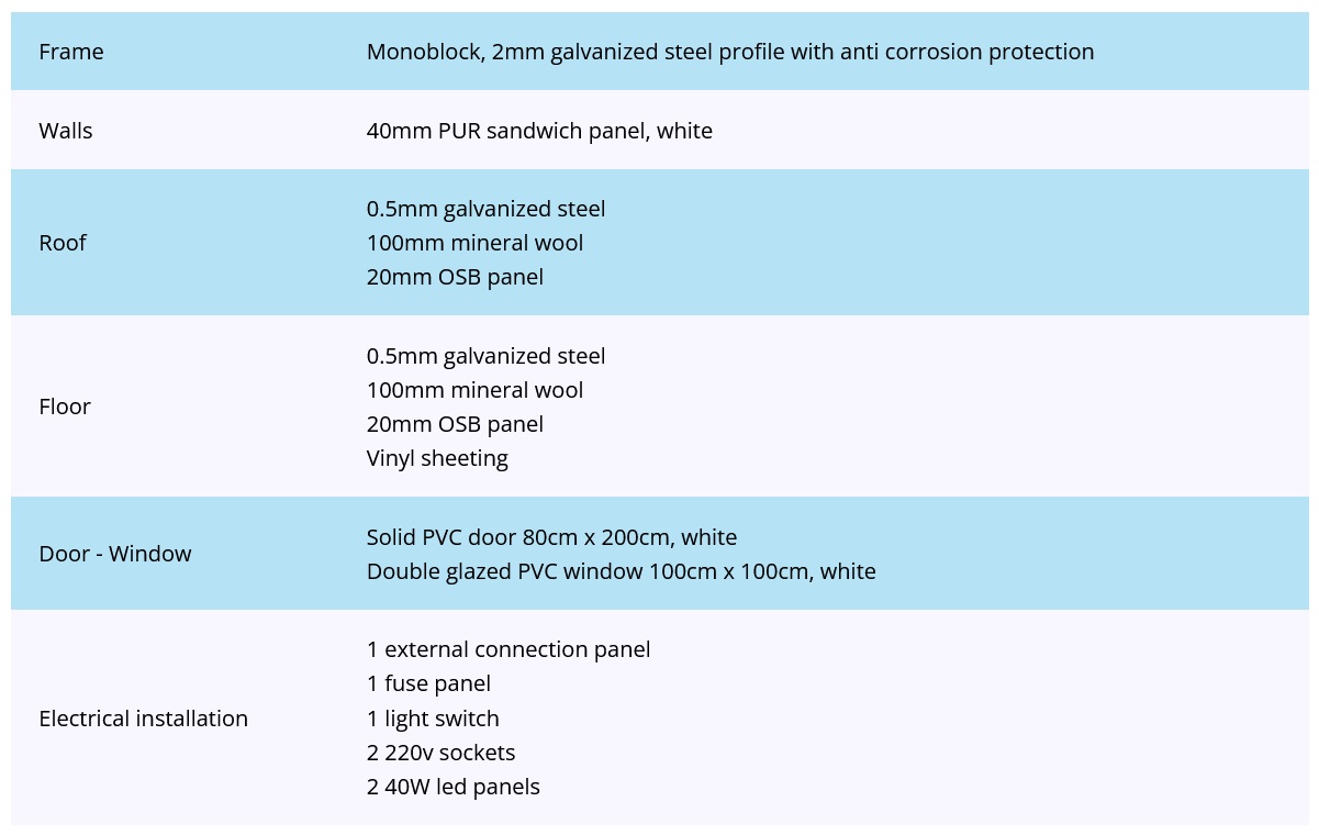 The specially made sandwich wall, roof and floor panels ensure high heat and sound insulation.